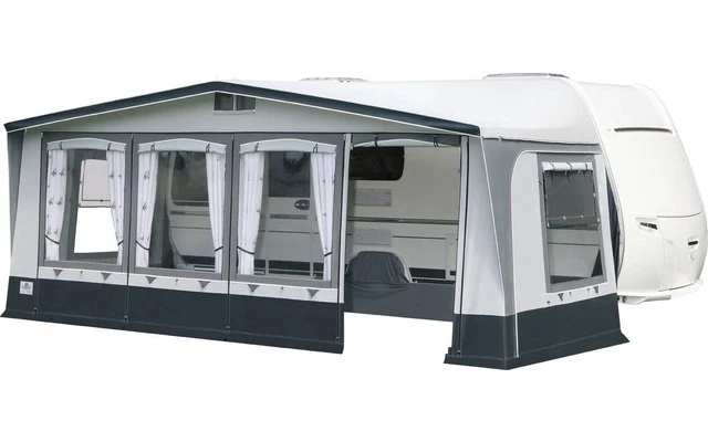 Für das Brand Tarifa Ganzjahresvorzelt wird für das Dach und die Seitenwände ein robustes Polychlorid-Material verwendet. Die Vorderwand des Tarifa wird aus atmungsaktivem TenCate – Gewebe gefertigt. Dieses Brand Vorzelt ist eine interessante Alternative für Saison- und Dauercamping. Die Elemente der Vorderwand sind individuell tauschbar (Tür kann an 4 Positionen sein). Alle Fenster mit Fensterklappen. Die Lüftungsgaze der Seitenfenster sind mit zusätzlichen Regenschutzfolien ausgestattet.