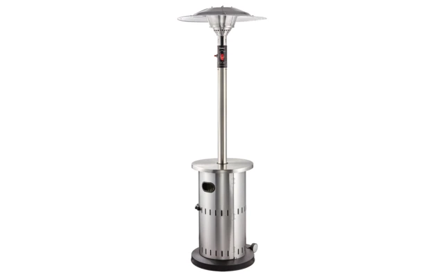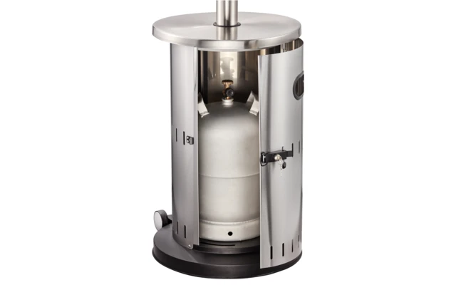 Die spezielle Konstruktion und Materialien des Solids sorgen für einen sicheren Stand. Im Korpus aus gebürstetem Edelstahl oder Stahl kann eine 11 kg Gasflasche verstaut werden. Besonders praktisch für die Aufstellung in der Gastronomie ist übrigens seine große Ablagefläche für Gläser und Aschenbecher. Für das platzsparende Verstauen lässt sich zudem auch das Standrohr versenken.
