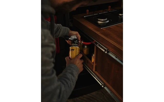 Die Box-Küche ist mit einem zweiflammigen Gasherd für 4 Kartuschen, einem Kompressor-Kühlschrank, der auch als Gefrierschrank verwendet werden kann, ausgestattet.