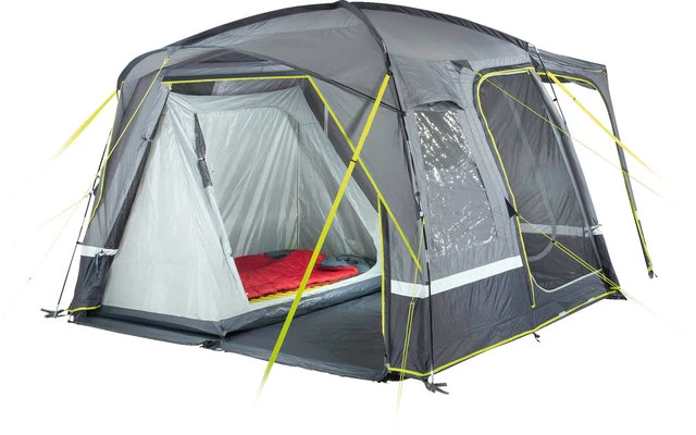 Die Dachkonstruktion und die Seitenwände bieten ein optimales Raumgefühl. Der fest vernähte Boden mit dem Außenzelt verhindert das Eindringen von Schmutz, Nässe, Krabbeltieren und schützt vor Zugluft. Die Bodenwanne ist am Eingang herunterklappbar und verhindert Stolperfallen. Der Eingang kann als Vordach mittels den mitgelieferten Aufstellstangen ausgestellt werden. 2 Gazefenster aus extra starkem, reißfestem 150D „Superfine“ Moskitonetz belüften den Wohnbereich und halten Insekten aus dem Zelt. Die innenliegenden Reißverschluss-Fensterklappen können einfach und variabel je nach Wetterbedingung bedient werden. 2 Klarsichtfolienfenster mit innenliegenden Reißverschluss-Fensterklappen können einfach und variabel bedient werden. 2 Dauerventilationen belüften das Zelt an regnerischen Tagen. Verschließbare, 50/50 teilbare Rückwand. Die gesamte Rückwand passt in die Easy Stow Away Tasche und es entfällt das lästige Aufrollen. Extra robuste Reißverschlüsse mit Regen- Abdeckung gegen Feuchtigkeit. 4 Neon gelbe verstellbare Sturmbänder und Abspannleinen sind in der Dämmerung gut sichtbar. Kabeleingang mittels Reißverschluss und Kabelführung für Beleuchtung.