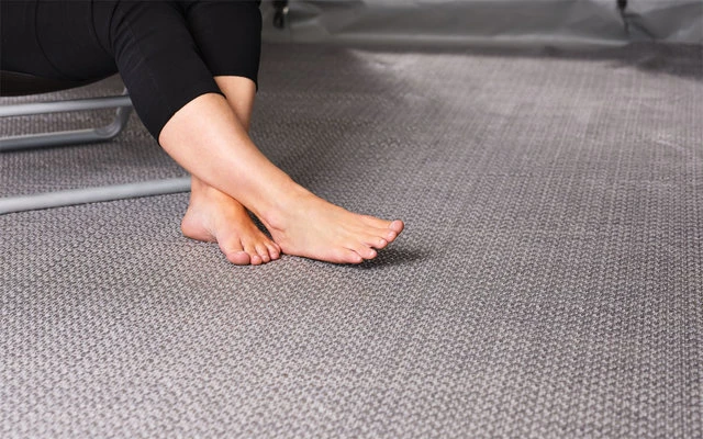 Der Zeltteppich Flint errinert an Feuerstein als Material, bei dem dunkle Grautöne auf klare Konturen treffen.