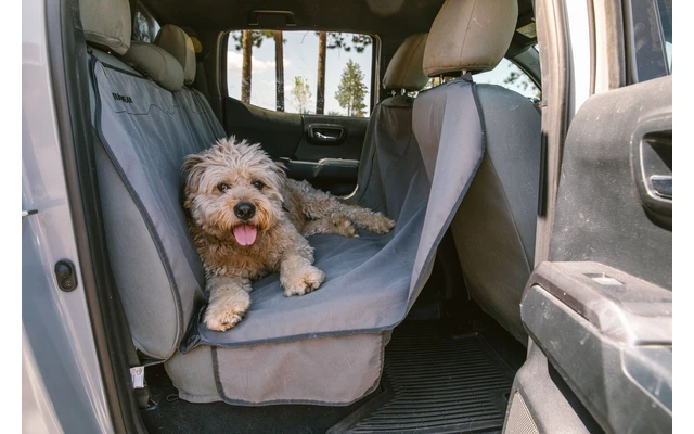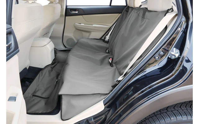 Strapazierfähiger, wasserfester, maschinenwaschbarer Autositzbezug, der sich auf der Rückbank oder als Hängematte anbringen lässt. Die sichere Befestigung hält den Bezug an Ort und Stelle und dank dem rutschfesten Material kann der Hund ruhig sitzen.