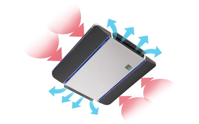 Der ebenfalls zum Lieferumfang gehörende kleine und modern gestaltete Innendiffusor mit schwenkbaren Luftaustritten vorne und hinten, weist eine Dicke von nur 4,2 cm auf und lässt sich aufgrund seiner geringen Größe leicht installieren. Das Modell ist mit einem hellblauen Multifunktionsdisplay und LED-Leuchten ausgestattet, das sich ebenfalls über die Fernbedienung leicht ein- und ausschalten lässt.