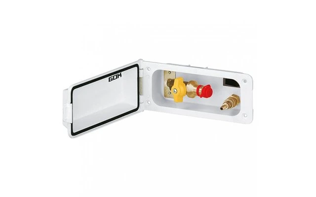 Zur Entnahme von Gas und Wasser. Mit Sicherheitsventil, Wassersteckkupplung, Schalter und Klappe mit Schnappverschluß. Farbe: Reinweiss. Einbaugröße ca. 16 x 7 cm. Mit zusätzlichem Schloß.