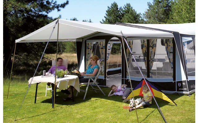 Das Castel hat eine Tiefe von 230 cm und ist speziell entwickelt für die Walker Vorzelte. Es ist aus Ten Cate 240 g/m2 Gewebe gefertigt und wird mit einem speziell dafür entworfenem Stahlgerüst komplett geliefert. Das Castel wird unter den Vordachstangen des Vorzeltes befestigt. Für Pioneer, können Sie mit dem Adapterset das Castel auch beim Walker Pioneer 240 montieren. Zustätzlich können auch Seitenwände montiert werden, lieferbar in der Farbe des Vorzeltes, mit Fenstern. Die Seitenwände sind austauschbar.