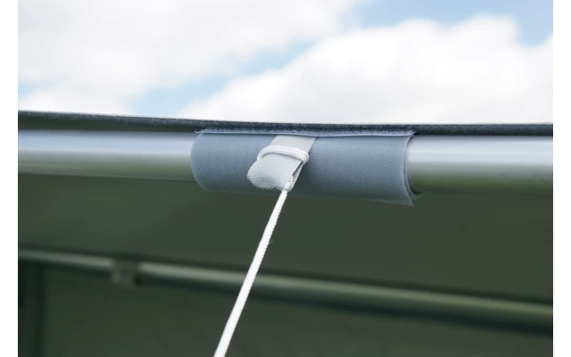 Empfehlung bei Verwendung der Markise als Sonnendach. Die Zeltdachbefestiger werden um die Dachstange gewickelt und am vorhandenen Flauschband des Rolli-Daches befestigt.